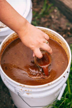 We create our fish fertilizer by fermenting ground fish with molasses and lactobacillus, a beneficial bacteria. The mixture ferments for 8 weeks, then is strained to create a micronutrient-rich solution ideal for foliar spray or soil drench. About 90% of the fish is digested in this process, providing vital nutrients for your garden.